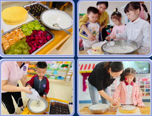 在老师的引导下,孩子们围着盆中搅动着奶油说:好香啊,一个个跃跃欲试又格外的专注,孩子们说:“我们要把做好的蛋糕送给祖国妈妈,祝福祖国妈妈生日快乐,繁荣昌盛!”
