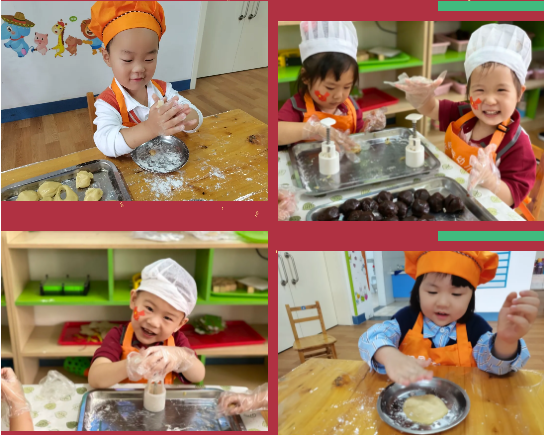 一片皮 ,一团馅,团团捏捏,放入各种不同图形的模具中,轻轻一压,成模成型。独特且充满浓浓爱意的小月饼,在我们暖暖的小手中完成啦。