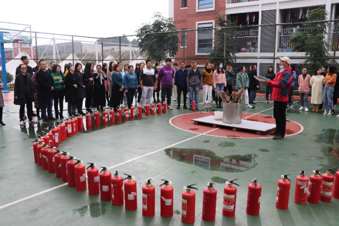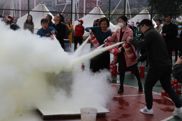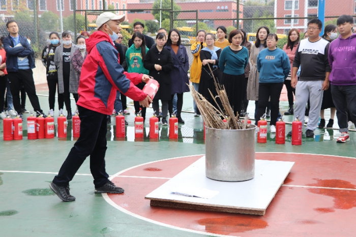 篮球场上,红色的灭火器围了一圈,教职工也围了一圈。培训员现场对灭火器的使用方法、灭火的注意事项、灭火要领等进行了讲解。同时利用实物演示,现场示范,讲解了如何正确扑救初期火灾,让防灾减灾知识“看得见,摸得着”。在培训员的指导下,教职员工纷纷拿起灭火器对准火源喷射,实现了从理论知识到实际动手能力的跨越。