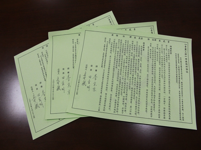 活动中,杜可副校长给由名师、准名师、教师骨干等组成的15名指导教师颁发聘书。在全体老师的见证下,指导教师与青年教师在师徒结对协议书上庄重的签上了自己的名字。一份师徒协议,一杯拜师茶,一份师傅“回礼”……简单的拜师仪式,让新老教师结下了深厚的师徒情谊。