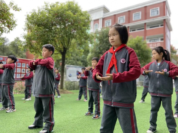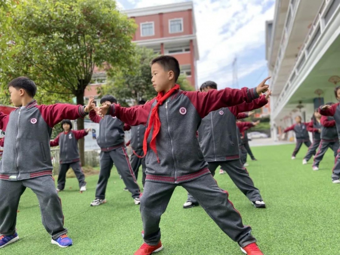 秋意渐浓,书小暖意融融。在轻柔的乐声中,孩子们迅速抱拳成礼,抬腿移步,“起势!”弓步推掌、马步冲拳……跟随老师的口令和分解动作,孩子们学得有板有眼、认认真真。