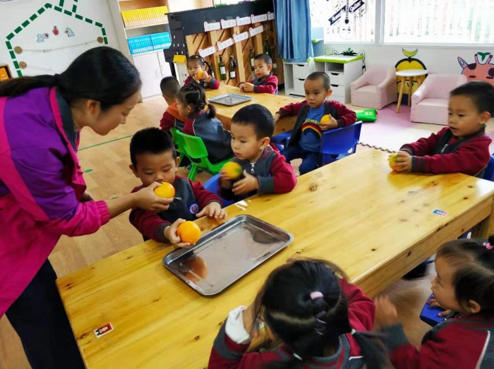 说来也巧,正在我们计划给孩子们先认识什么水果的时候,刘致远妈妈送了两箱橙子来,实在是万分感谢。我们通过看一看、摸一摸、闻一闻、剥一剥、尝一尝五个部分来认识了橙子。