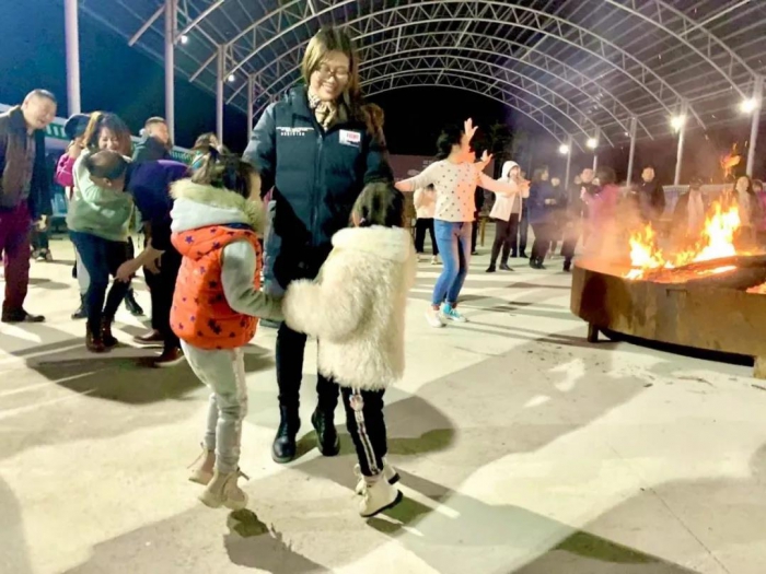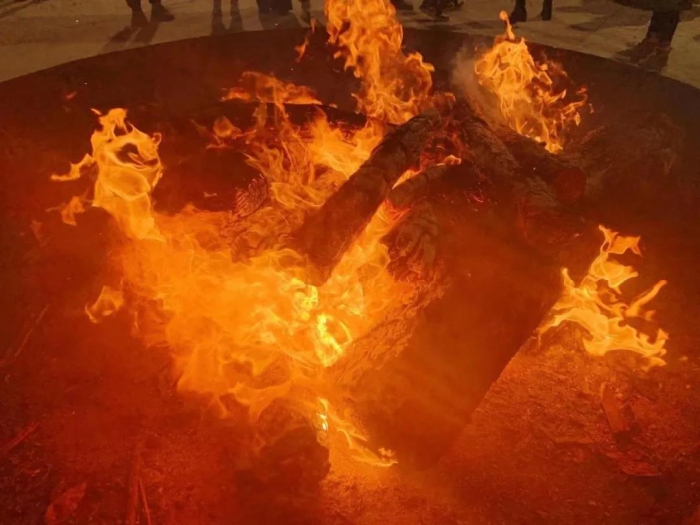 这冬天里的一把火,驱走了严冬的寒意,也带来了光明和温暖;红红的篝火,把每个人的笑脸都映照得热辣辣的、红扑扑的。老师们手拉手,心连心,跳起了欢快的舞蹈,暖暖的情谊在火光的映照下分外迷人。