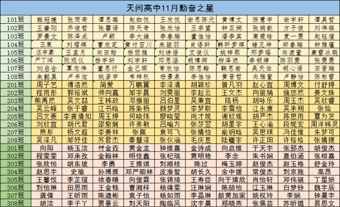 天问高中11月勤奋之星名单已公布