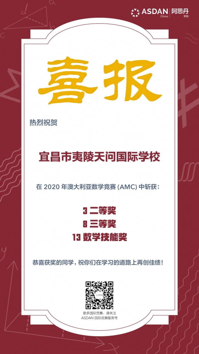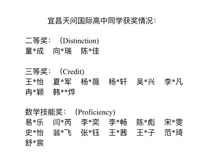宜昌市仅有四名同学荣获数学竞赛二等奖(Distinction),其中我校的童*成同学,向*瑞同学和陈*佳同学三名同学获此殊荣,斩获全市前三名。