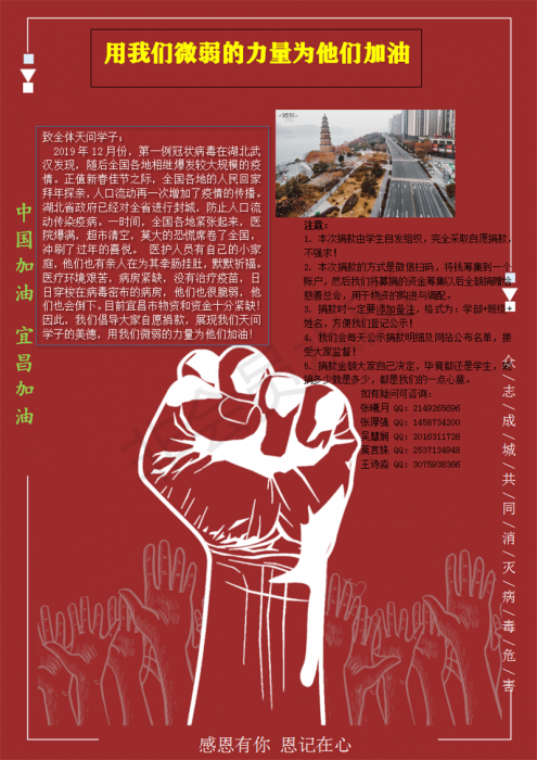 2020年3月,面对严重的疫情,国初学子在904班张厚强和张曦月等同学的自发组织下一起组成了“天问爱心小分队”,并创建了微信群,广泛宣传,发动同学们为抗疫奉献爱心,大家以自己的绵薄之力,捐赠善款,为宜昌加油,为中国加油!