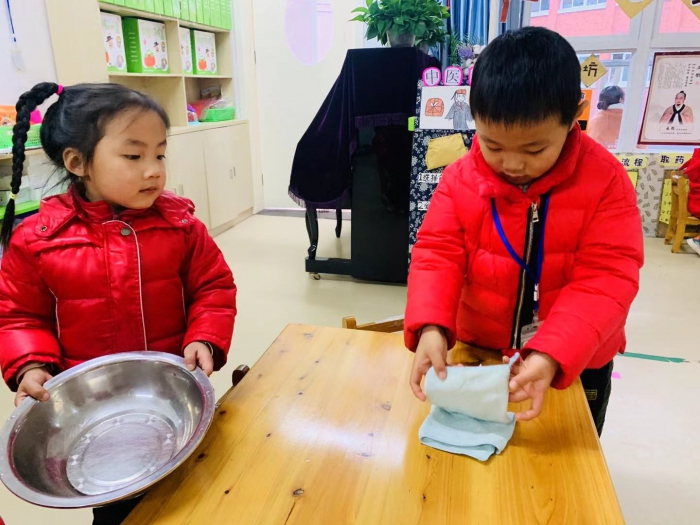 于是,我准备了几块抹布,从第一天的值日生开始,在餐后和午休后的时间里,指导他们帮助老师清倒餐盘内的垃圾、帮助老师擦桌子、收拾桌面、整理被褥等。值日生们非常乐意,高高兴兴地帮助保育老师收拾着:收拾餐具、擦桌子、摆椅子、整理被褥、图书等。