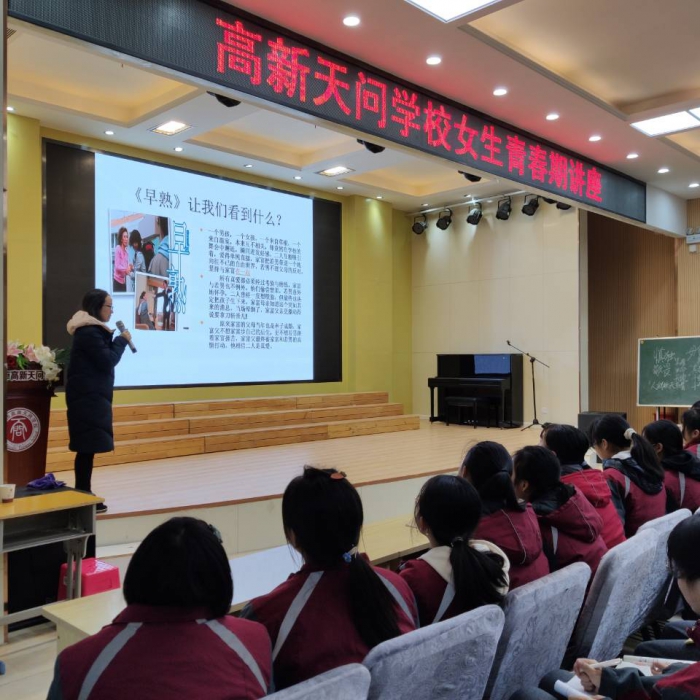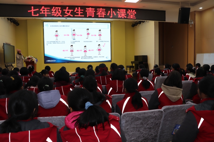 为了帮助处于刚刚步入青春期的初中女生认识青春期,了解青春期的变化,更好的认识自己,学会与同学正确的相处,把握与异性交往的尺度,快乐的度过青春期,并贯彻落实全省卫生与健康培训会议精神,12月14日下午,高新天问初中开展了以“青春小课堂”为主题的女生健康教育知识讲座。