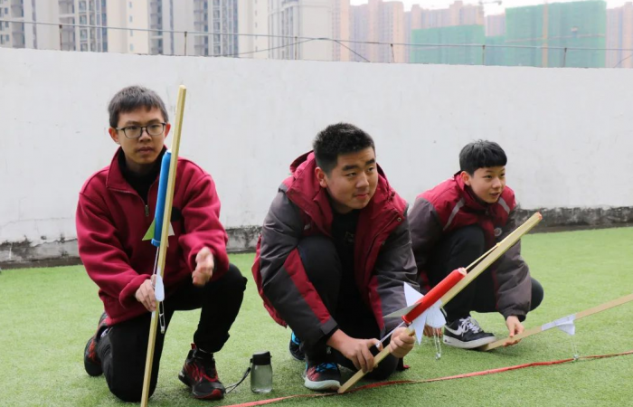 朱京希教授精心设计了“弹簧火箭”实验,带领同学们分组制作“火箭”,实验彻底调动了大家的学习兴趣,同学们集思广益,将“火箭”尾翼设计成三角形、四边形、梯形甚至弧形……