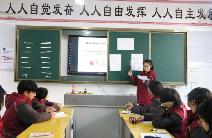 尹钰蓉老师的阅读分享课选择了英文名著《Who Moved My Cheese?》,课堂上特别将课桌围成圈,营造小组研讨的学习氛围。