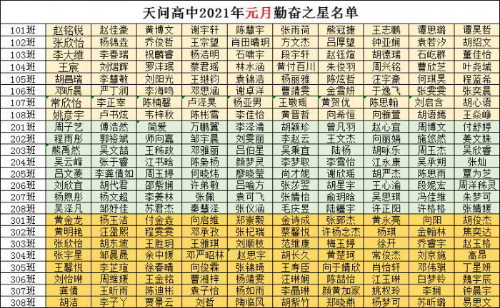 天问高中2021年元月勤奋之星名单已公布