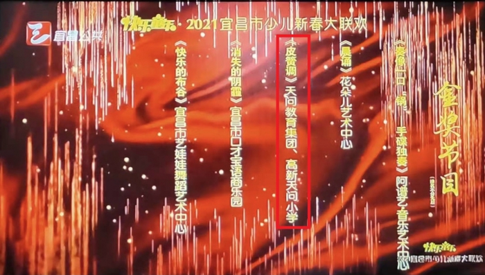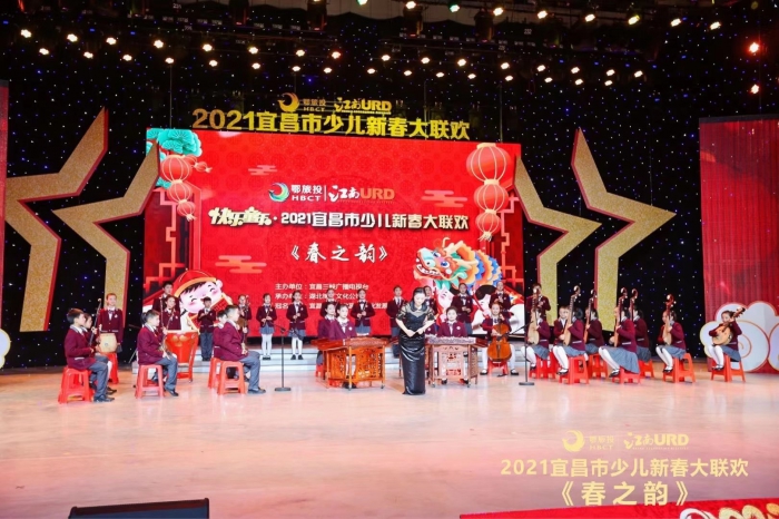 在2021宜昌市少儿新春大联欢的演出中,高新天问小学民乐团、戏曲团合作完成的节目《皮簧调》,在众多优秀节目中脱颖而出,荣获金奖。