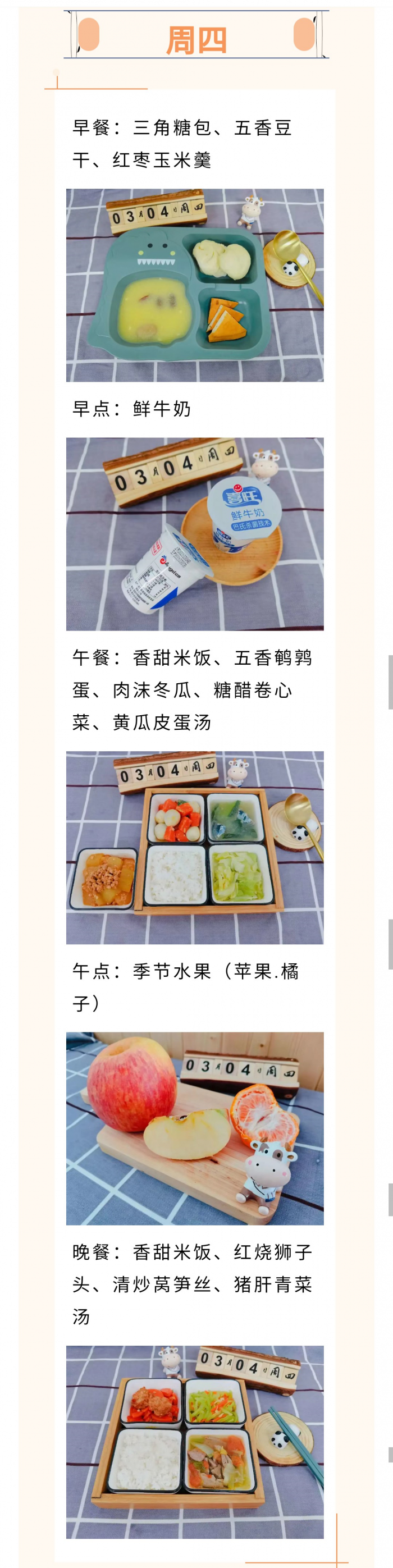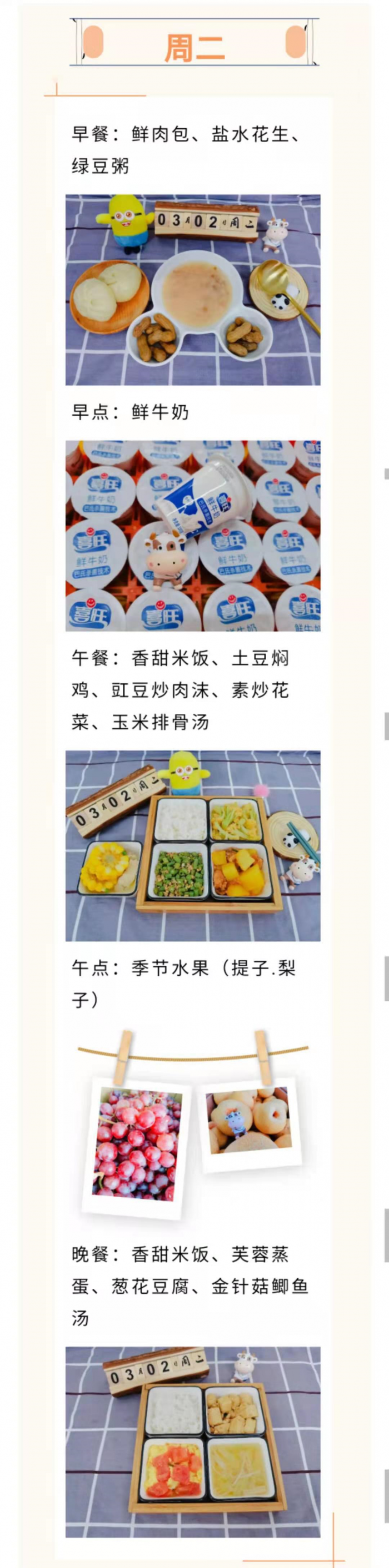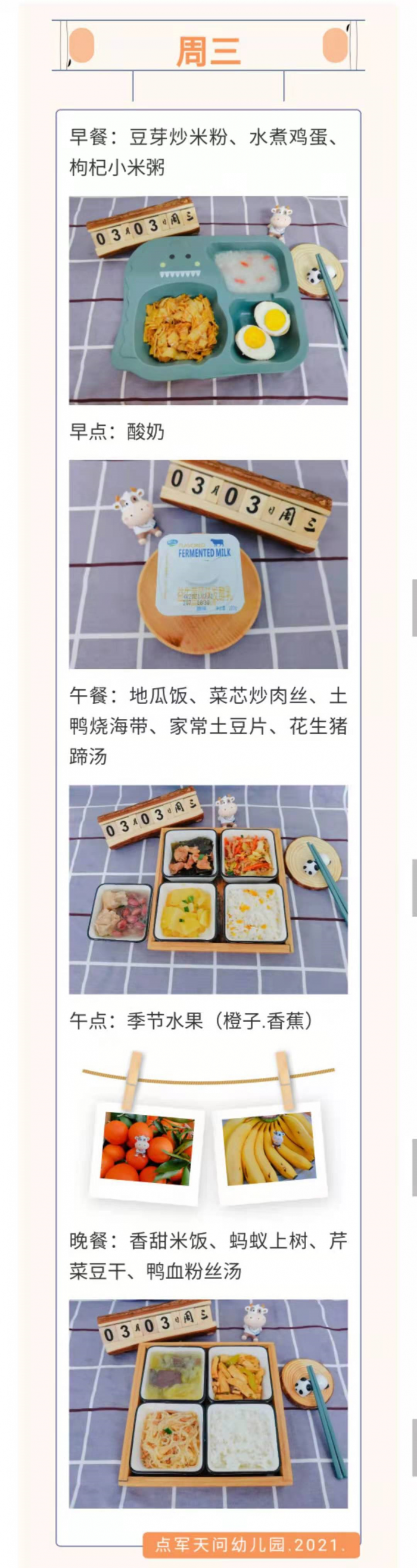 我们点军天问幼儿园遵守孩子年龄特征、身体所需营养成份,为孩子们提供定时定量,荤素营养搭配餐点。