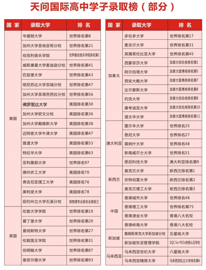 截至2021年,我校毕业生先后荣获美国公立常青藤华盛顿大学、佛罗里达大学、匹兹堡大学;英国伦敦大学学院、爱丁堡大学;加拿大多伦多大学、麦吉尔大学;澳大利亚墨尔本大学、悉尼大学;中国香港城市大学、香港理工大学等世界顶级名校录取通知书!