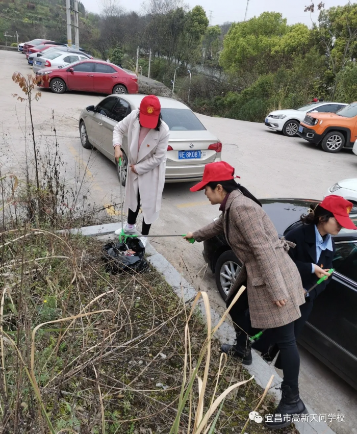 3月16日,高新天问学校党支部组织全体党员教师开展了校园停车场及周边垃圾清理志愿服务。活动中,党员教师们统一佩戴党徽、头戴小红帽,手拎垃圾袋和垃圾钳等清洁工具,围绕学校周边树林和停车场,进行了细致的清理。大家俯下身、弯下腰,细细地捡,慢慢地拾,连烟头、纸屑等隐藏在树丛中的细小垃圾也不放过,认真劲儿完全不输给专业环卫人员,为全体师生营造了良好的学习生活环境。