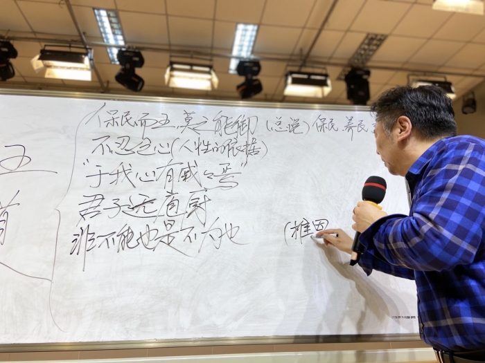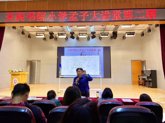 2021春季学期,书院小学全体教师开启了春季学期听读一本经典之读《孟子》的活动,此次活动特别邀请了集团国学大师顾景荣院长给老师们进行系列讲座,给老师们现场指导,指点迷津。 4月15日,天问书院小学师生共聚大礼堂,聆听顾院长《孟子》大讲堂第二期,献礼四月读书节,品读国学经典,弘扬传统文化。