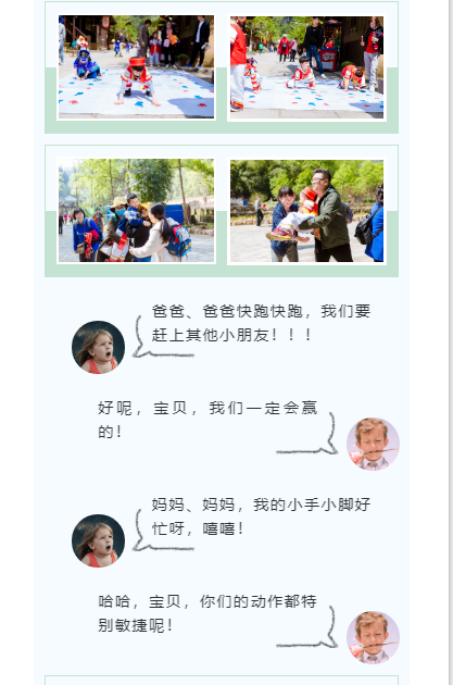 “成长需要陪伴,童年应该快乐”。在蓝天白云下,绿水青山中,父母放下了忙碌的工作,陪同孩子们利用手中的材料创造着属于他们之间的回忆,这样的亲子活动,虽然家长会略感疲惫,但孩子们是快乐的,是放飞自我的!