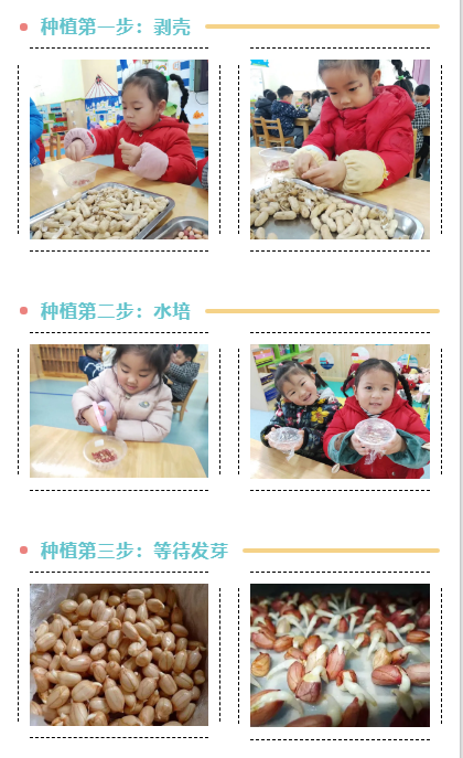 种下一颗花生,待花生发芽,悉心照顾花生,观察花生的变化,幼儿对花生产生了浓厚的探索兴趣。