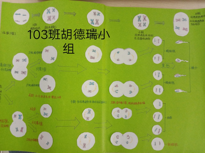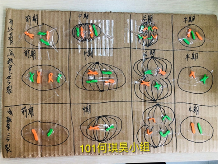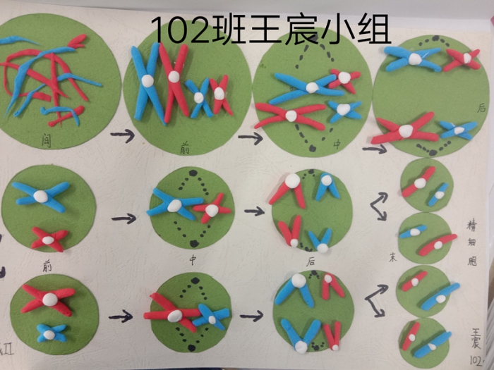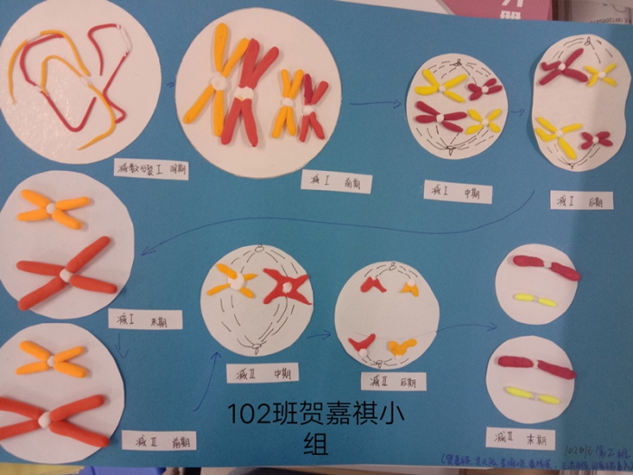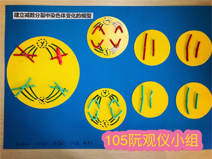 为了加深学生对减数分裂过程中染色体行为变化的认识,趁着五一假期,学生们以小组为单位开展了减数分裂模型制作的活动。在模型制作过程中,学生们积极参与,利用彩纸,橡皮泥,超轻粘土等材料制作出了不同时期的细胞和不同形态的染色体。
