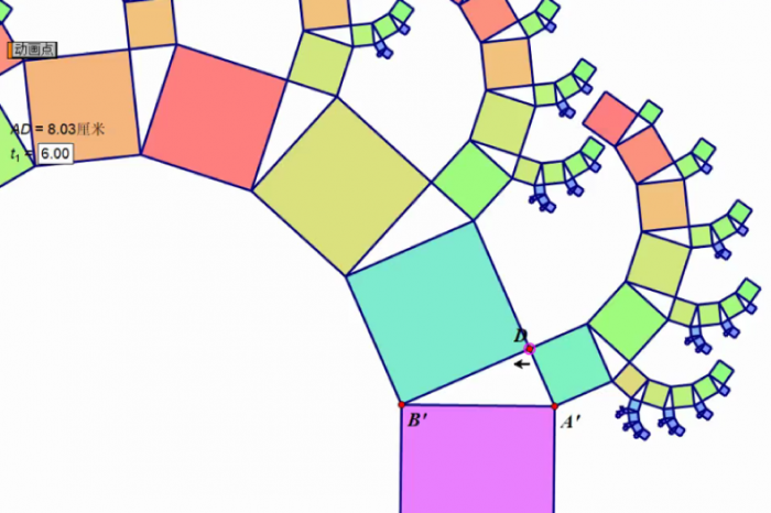 最具科技感的实验要属“勾股定理树”了,同学们利用《几何画板》软件的“深度迭代”功能,设计出了漂亮的“勾股树”。在老师的指导下,大家还开拓思维,进一步研究《几何画板》在“变化的图形中,发现恒定不变的几何规律”,开展不同的“数学实验”。