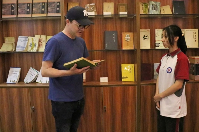 在屈原文化馆,李可奕和何婧依同学向记者团一行讲解了屈原之于天问的特殊意义。当看到馆内珍藏的英文版《楚辞》时,英籍记者Owen非常惊喜,他兴奋地即兴朗读了其中一段,亲身感受了屈原诗词之美。