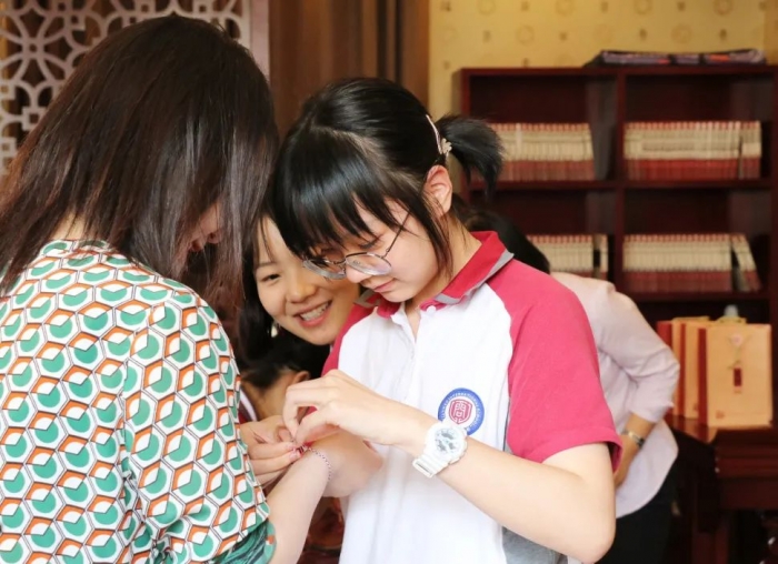 活动现场,天问国际高中执行校长王清玲女士向客人们赠送了两份珍贵的礼物——丝绸制作的屈原《天问》藏书和“天问一号”航空模型。同学们还亲手为每位客人编制并佩戴了一条精美的彩绳,象征着大家对客人们的美好祝愿。
