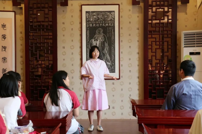 在国学沙龙,主持人郭恩盈同学用流利的英语,落落大方地欢迎采访团一行的到来。