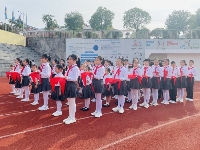 “祝贺一年级40名同学光荣加入了少先队组织。同时,祝全体同学六一儿童节快乐。”胡菲校长寄语新队员,“希望所有的队员们时刻以优秀少先队员的标准严格要求自己,继承发扬少先队的优良传统,知行合一,扎实本领,为建设我们伟大的祖国时刻准备着。”