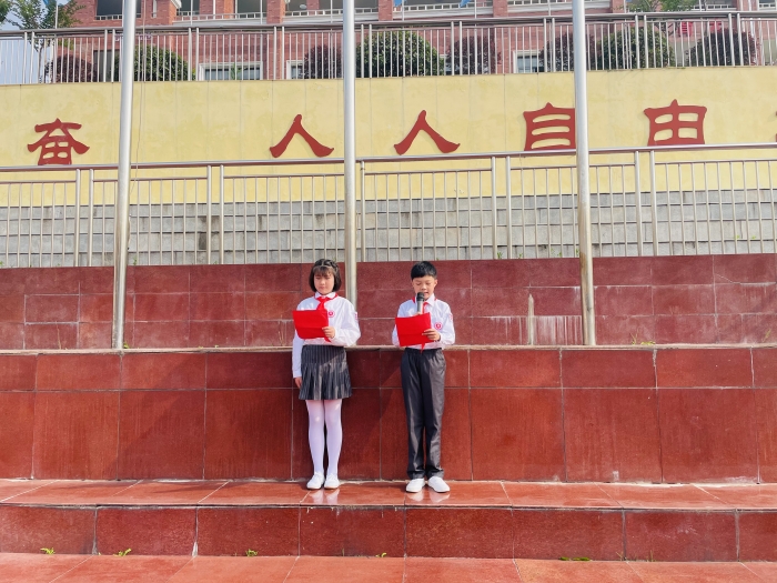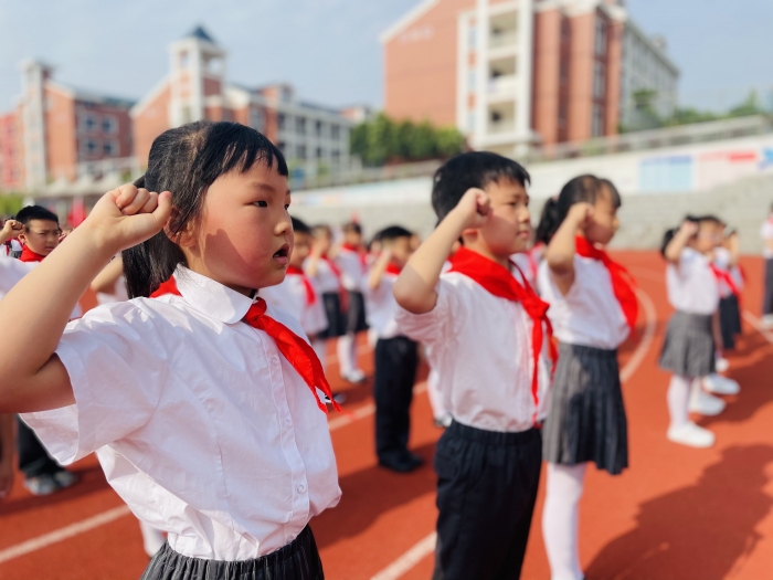 戴上红领巾的新队员们,高举右拳,面向队旗,庄严宣誓:“我是中国少年先锋队队员,我在队旗下宣誓,我热爱中国共产党,热爱祖国,热爱人民,好好学习,好好锻炼,准备着:为共产主义事业贡献力量!”响亮的誓言在校园回荡,在队员们心中澎湃,时刻鼓舞着新队员们朝着未来和理想努力奋进。