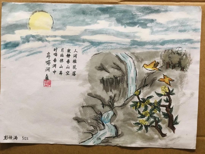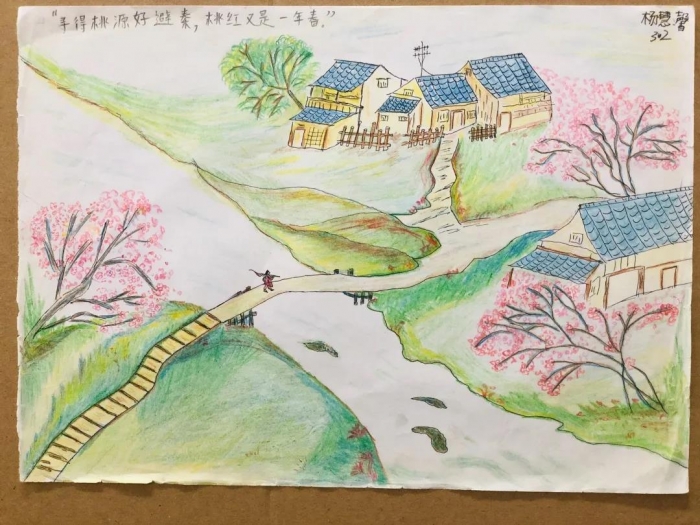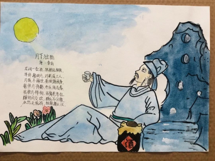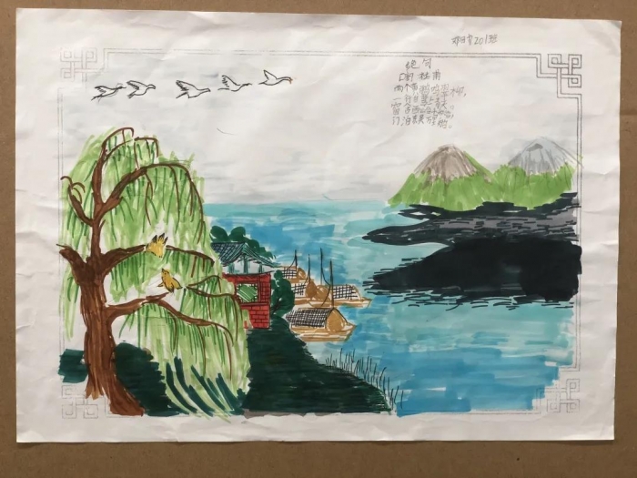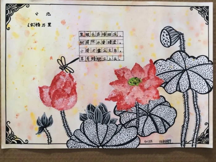 诗中有画,画中有诗。小书宝们想象力爆棚,用自己手中的画笔铺纸勾勒,淡妆浓抹,描绘出一幅幅形象逼真的古诗词绘画作品。荷塘月色、依依垂柳、枝头红杏、蜻蜓戏水,跃然纸上。