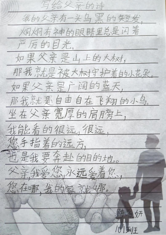 诗言情,诗言志。孩子们以父亲节为契机,自由创作儿童诗,献礼父亲节,用文字表达对爸爸的感恩与爱。孩子们吟诵着写给父亲的诗,稚嫩的声音里传递的是浓浓的深情与爱。