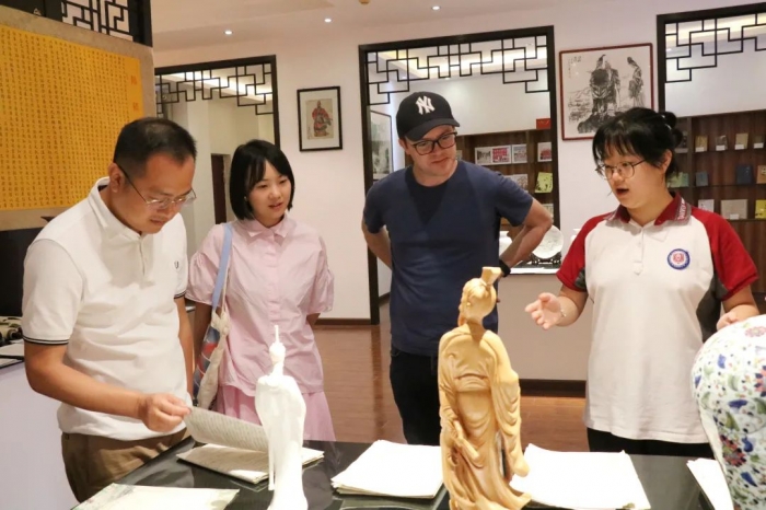 在屈原文化馆,李可奕和何婧依同学向记者团一行讲解了屈原之于天问的特殊意义。当看到馆内珍藏的英文版《楚辞》时,英籍记者Owen非常惊喜,他兴奋地即兴朗读了其中一段,亲身感受了屈原诗词之美。