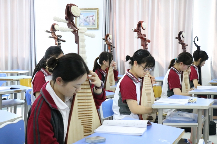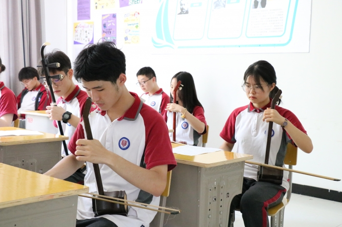 自高一入学以来,天问国际高中的同学们根据兴趣爱好,从琵琶、二胡、竹笛中选一种民族乐器学习。每周一次专业课,每天一次晚练习,由易到难,循序渐进。经过三年学习,让国高学子人人会演奏一门乐器,人人均有一技之长。