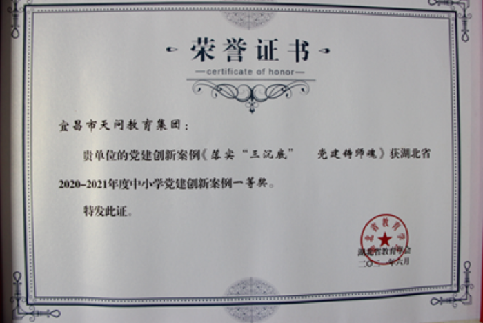 6月17日,在湖北省教育学会、湖北省中小学党建研究专委组织的“庆祝中国共产党成立100周年暨新时代学校党建品牌创建研讨会”上,天问教育集团报送的党建案例——《落实“三沉底” 党建铸师魂》脱颖而出,荣获湖北省2020—2021年度中小学党建创新案例一等奖。