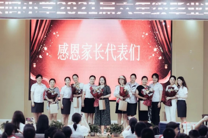 短暂的六年时光,我们在新小这个温馨的大家庭努力学习,快乐成长,离不开我们背后默默付出的家长们,今天让我们用鲜花像她们表示感谢。在新小,还有着一群像妈妈一样细心的照料着我们,关怀着我们的老师,他们就是后勤老师,毕业之际,就用鲜花表达内心深深的感激。学生代表向校领导、学科老师献花致谢,感谢老师引领他们通往知识的殿堂,教他们为人处世的道理。