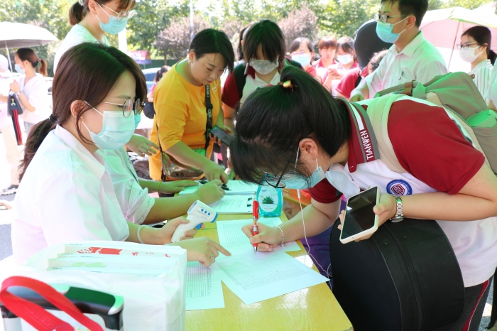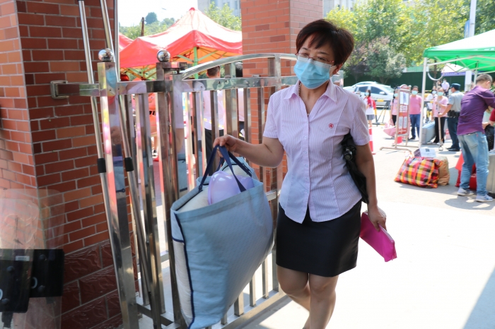 排队、测温、扫码……同学们一一进入久违的校园。因防疫要求,家长不能入校。老师们耐心的给同学们指引寝室方向,热情的帮忙搬运行李,让新同学们尽快融入校园。