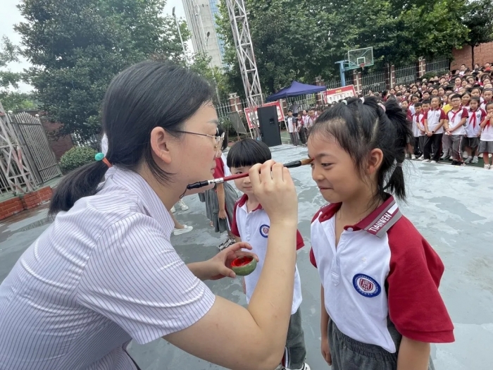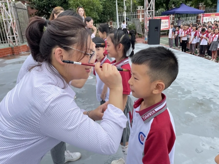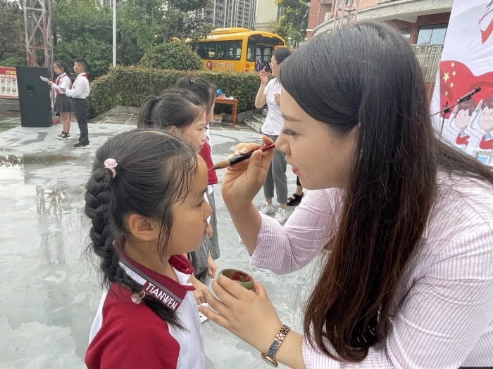 “朱砂启智”又称“开天眼”。“痣”通“智”,意为开启智慧,期冀孩子们好读书,读好书。老师们在给孩子们的眉心点上红痣的同时,也表达着他们对孩子们最美好的祝福和殷切的希望,愿孩子们在以后的学习中能勤奋努力,志存高远。