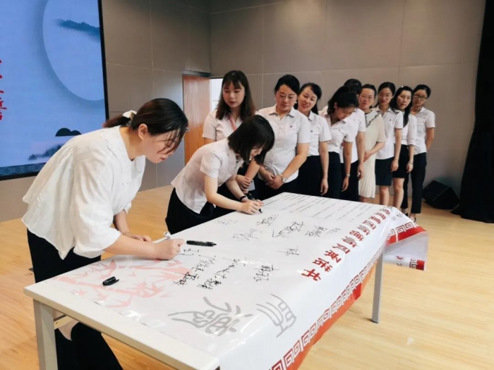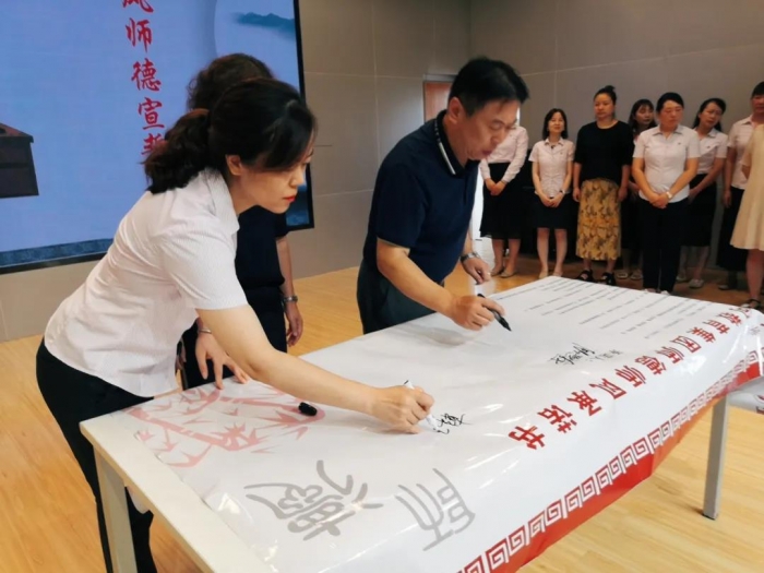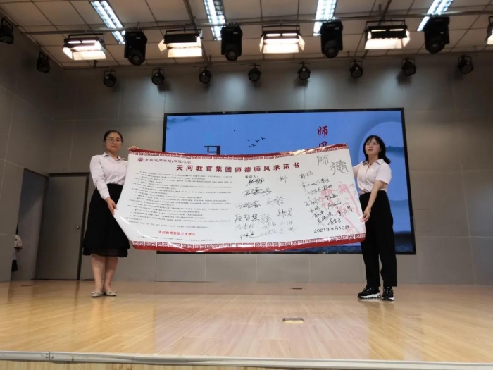 师德建设是教师工作的核心内容,“师者,以德为先”。全体教师在宜昌天问学校党支部书记韩亚飞的带领下,举起右手,庄严宣誓,承诺书从爱岗敬业、关爱学生、为人师表等方面对教师提出了要求。紧接着,老师们在师德师风承诺书上郑重地签下了自己的姓名并庄重地按下手印。