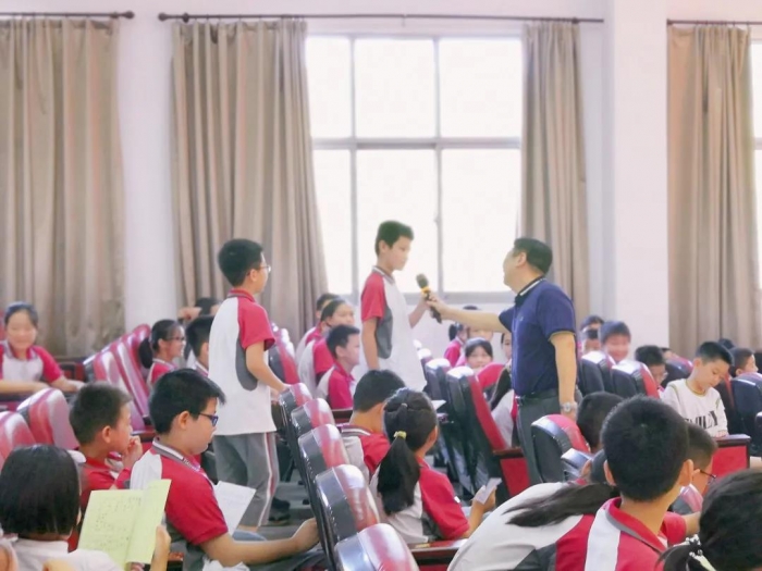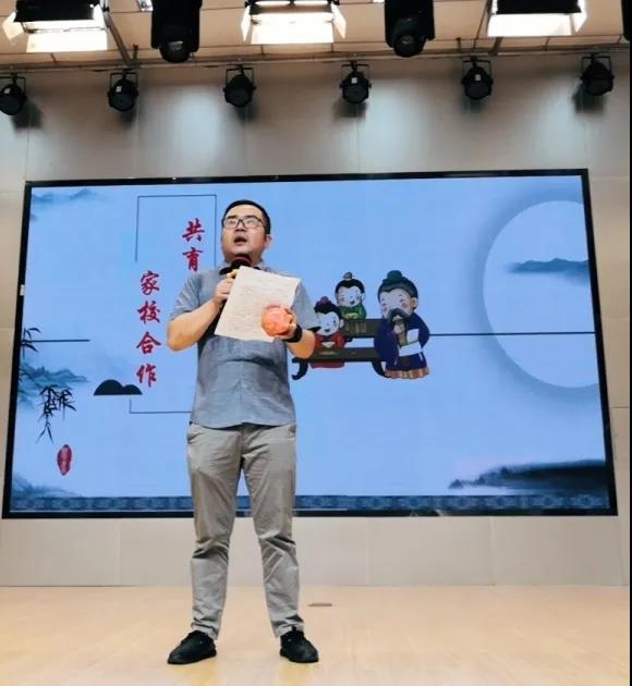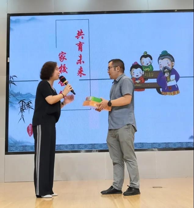 一年级家长代表周芷淑爸爸真诚地为老师们送上节日祝福,感恩每一位老师对孩子的无私付出。随后袁校长代表学校为周爸爸回赠礼物,家校合作齐努力,共育英才成栋梁。