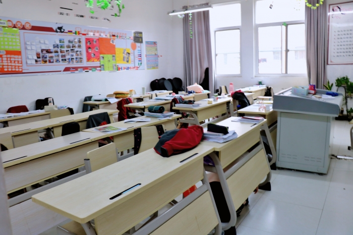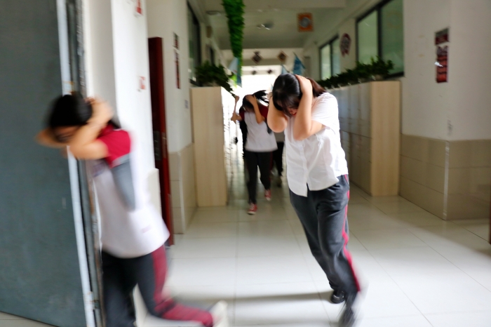 上午9点55分,当警报响起的一瞬间,同学们迅速反应,抱头、闭眼,躲在各自的课桌下或课桌旁,尽可能用书包或其他物品保护头部。