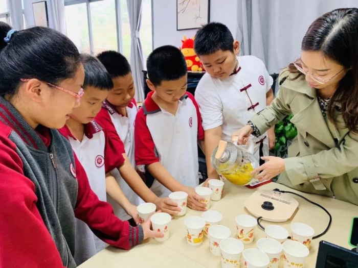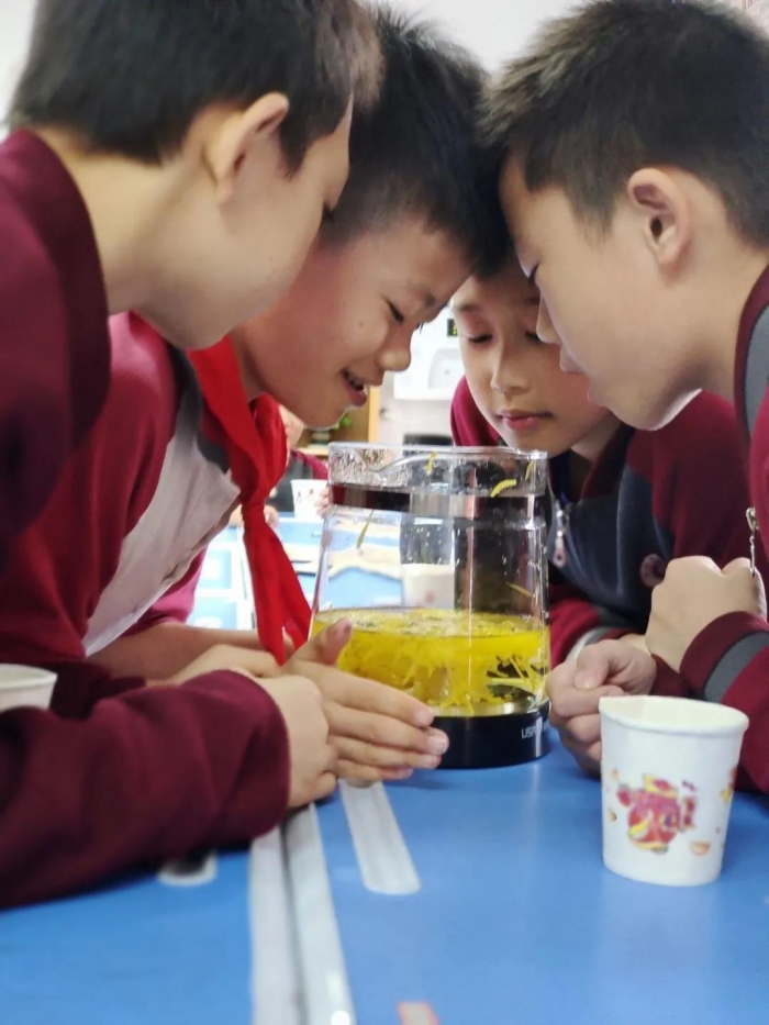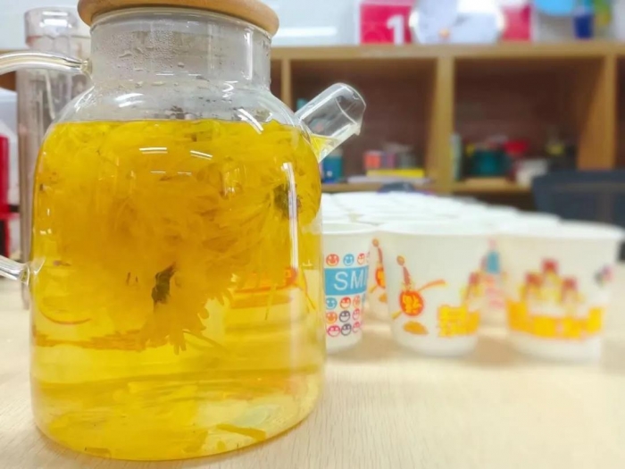 在重阳节饮用菊花茶或是菊花酒,有恭祝老人们长命百岁的寓意。小书宝们手持茶杯,轻嗅菊香,品茗静心,茶韵悠然。轻柔的音乐声中,边品茶边听爷爷奶奶过去的故事,一起探寻家族的根脉。