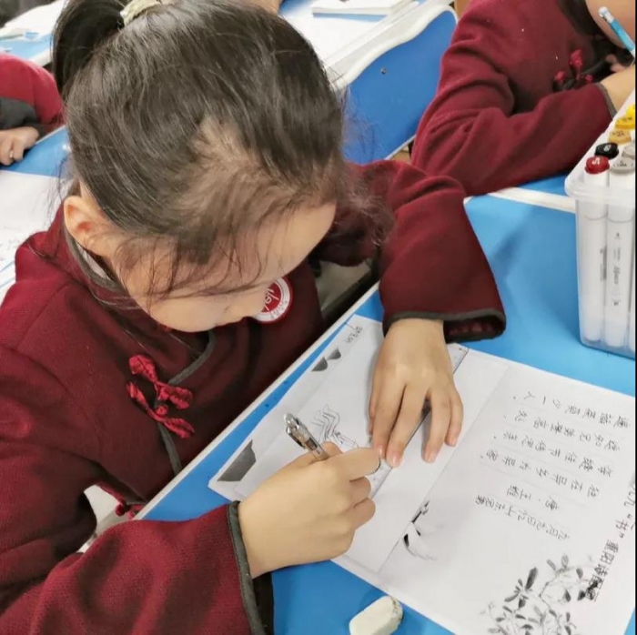 三四年级的小书宝诵菊诗,配菊画。孩子们用灵巧的双手,把爱汇入到图画中,线条的设计,色彩的配合,都展现出孩子们对重阳节的独到感悟。