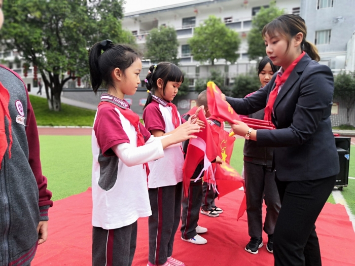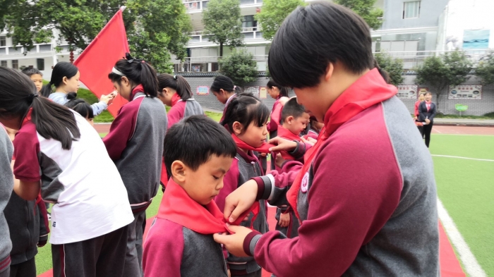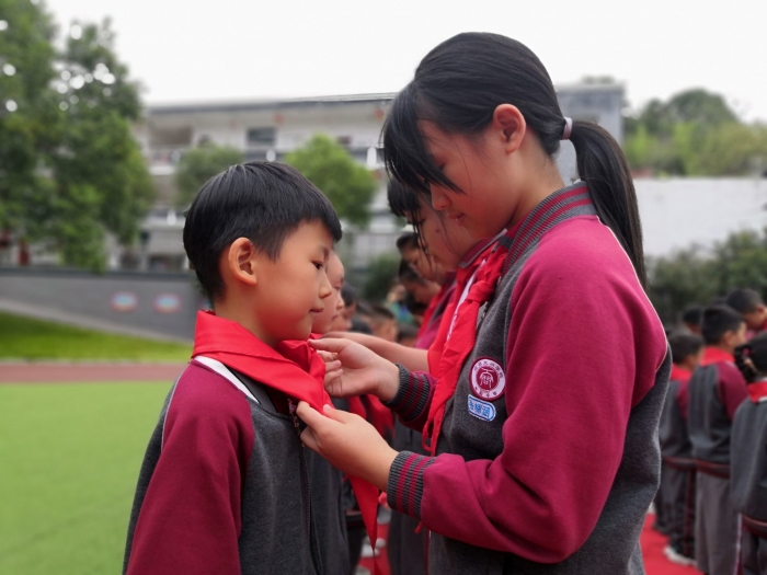 新队员在辅导员、老队员的见证下,光荣的加入了中国少年先锋队,成为了一名少先队员。新队员从老队员手中接过领巾,老队员协助新队员系在胸前,不仅增强了仪式感,更与新队员一起体验、成长!
