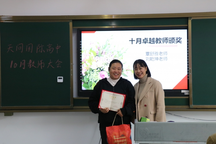 会议上,覃舒雅老师和刘乾坤老师分别获得10月优秀教师奖励。