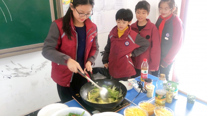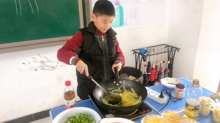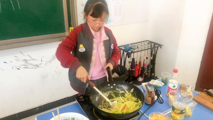 首先是老师和孩子们合作准备食材,接着丁老师亲自示范,且看她手里的锅铲上下翻飞,阵阵香气随之飘出,这哪里是老师,分明是一代厨神嘛!