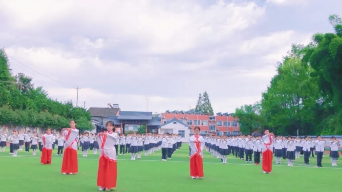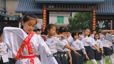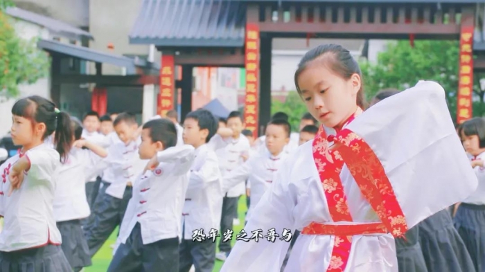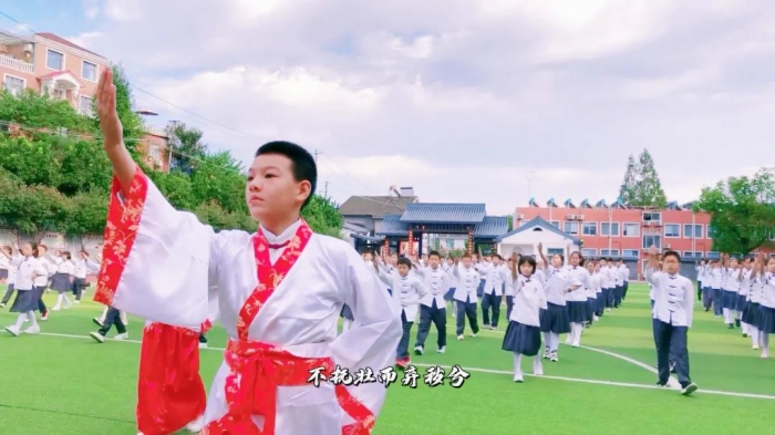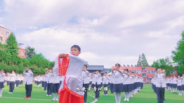 以文化人,以美育人。天问书院小学一直以传承优秀传统文化为己任,培养拥有君子风范、领袖气质的高雅学子,造就自主发展的人。围绕学校的育人目标,书小将国学与体艺有机结合,自主编排了一套彰显荆楚文化,传承屈子精神,意味深远的课间操——《楚韵离骚》。