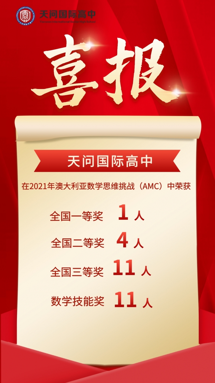 天问国际高中学子在2021年澳大利亚数学思维挑战赛(AMC)中再创佳绩。27名学子从全国2000多所国际学校和重点学校的近40000名学生中脱颖而出,取得优异的成绩!