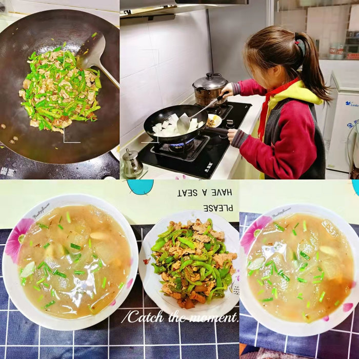 自己摘的菜当然是自己下厨。一到家,同学们就开始张罗各自的“小厨台”,他们将今日的收获有次序地摆放,随后俨然大厨般进入了工作状态。各种原材料在他们有条不紊的准备工作后渐渐有了食材的摸样。一菜一饭,皆需要细心准备,切菜、洗菜、烹饪、成品。无论过程有多少困难,无论结果是酸甜苦辣,均需要去亲身经历。烹一道菜如是,成长亦如是。