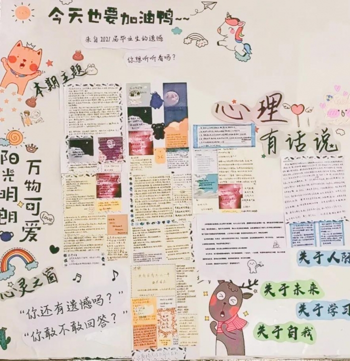 我觉得书信的沟通方式是一个很重要的存在。有些学生不善于沟通表达、有些还不是特别信任老师、有些不好意思把自己的问题放在明面上来讲,所以书信的方式提供了一个很好的平台让学生去表达和倾诉。在来信中学生会写一些自己的困惑,有的学生会吐槽最近的坏心情,有的学生想跟老师聊天倾诉。信件一般有署名信和匿名信两种,署名信我会在教室没人的时候放到学生课桌里,匿名来信会用小卡片的形式放在心理展报旁边。我每周都会收到很多学生来信,所以很多时候我都埋头在办公室里写回信。