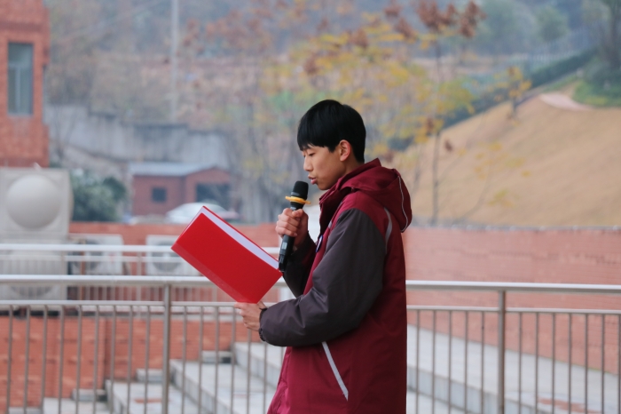 升旗仪式上,天问国高高二童天成同学发表国旗下讲话。